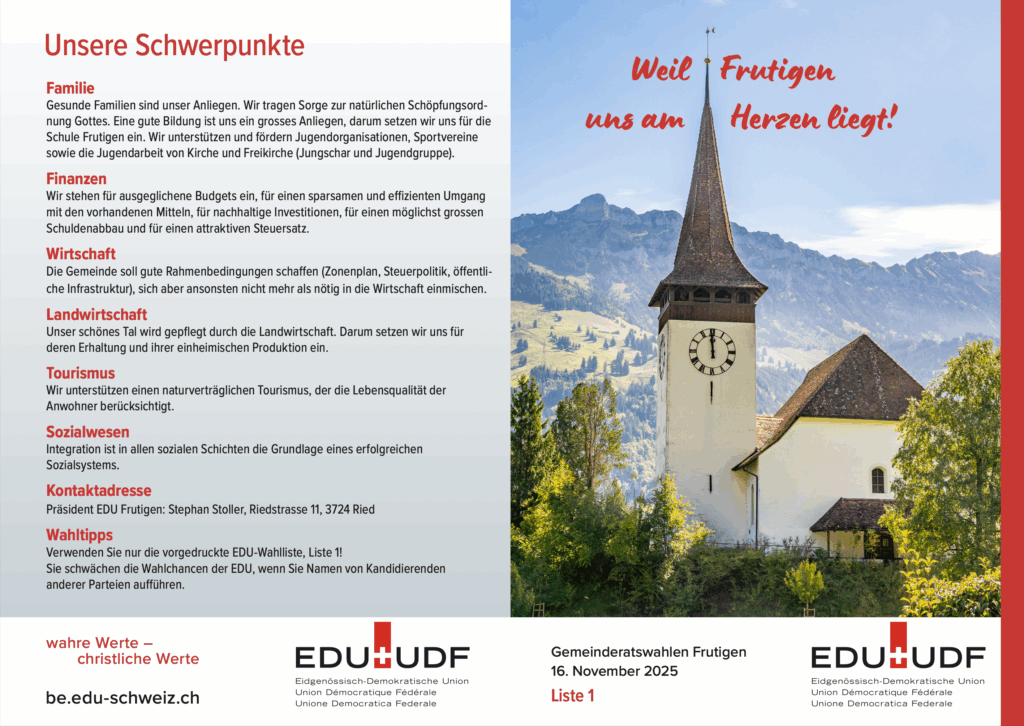 Die EDU Frutigen besteht seit 1995. Sie hat sich immer wieder an den Gemeindewahlen beteiligt, ist mit Standaktionen aktiv und gestaltet mit Wort und Tat mit. Frutigen ist seit Jahrhunderten eine innovative Gemeinde. Auch Tourismus und Sport sind hier kein Fremdwort. Die Gemeinde liegt im Kander- und Engstligental und erstreckt sich von der Niesenkette bis zum Gehrihorn. Die aktuelle Einwohnerzahl beträgt ca. 7000 Personen.